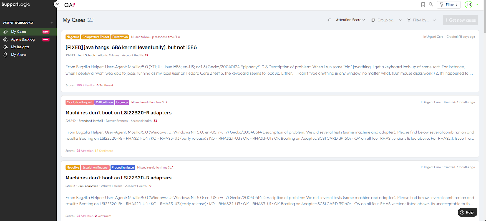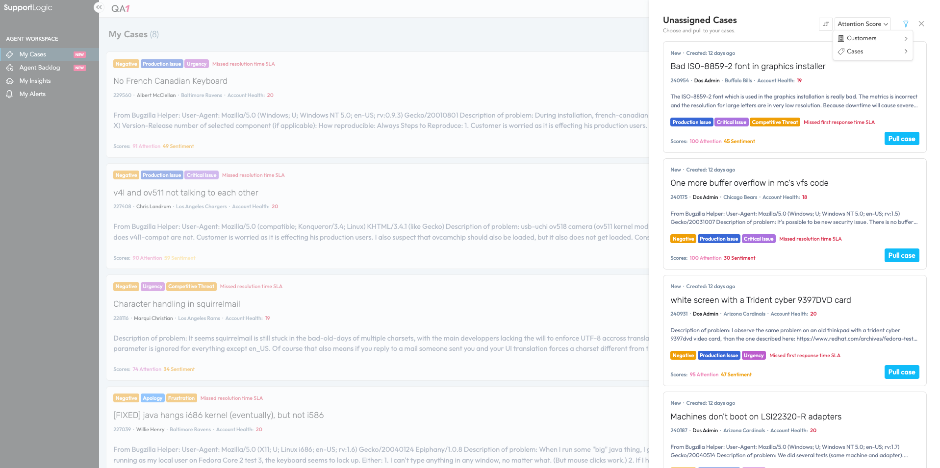 Agents can better organize their workload with a centralized view of their cases. The "My Cases" page features a prioritized list of cases, each highlighted with critical SupportLogic activities that demand immediate attention, such as: