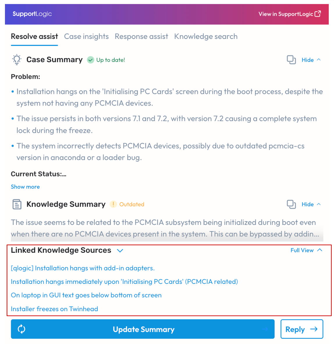 Ability to link relevant knowledge sources to Case: Support Engineers can link one or more knowledge sources that they found to be useful and relevant in resolving the issue, to the support case. The linked knowledge sources can be accessed from within Resolve Assist using the “Linked Knowledge Sources” filter. This association helps in improving search precision of subsequent search for knowledge.