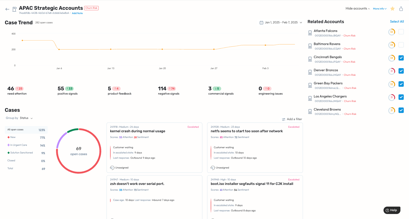 When reviewing Virtual Accounts and Virtual Groups, users can see an average health score - purely based on the Account Health Score of the related Accounts. Users can see Case Trend and Signals across all the support cases associated with the Accounts in the Virtual Account or Virtual Group. Users can review and analyze further by grouping and filtering at case level or at related account level.