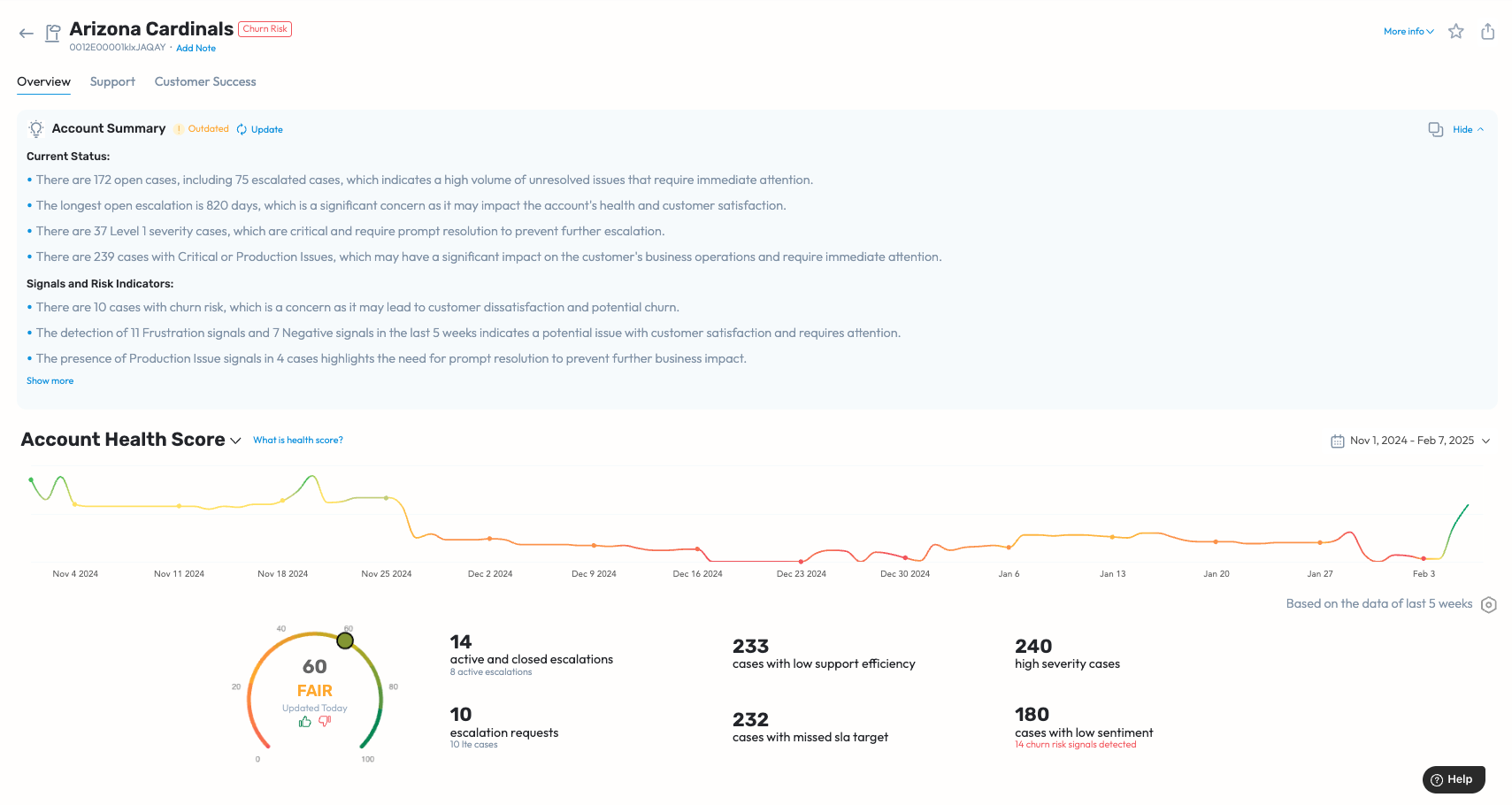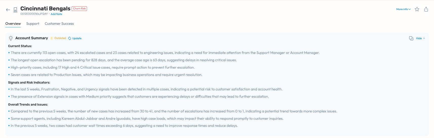 Account Summary iFrame: Account Summary provides Insights about the Account such as current issues that need immediate attention, risks identified based on signals detected across conversations, and overall patterns & trends that need to be addressed. For example: It surfaces cases that have longer than usual wait time, cases that are having production issues, support engineers that are overloaded and more, helping the Account Team and Customer Success Team members with the right data points required to resolve the situation in collaboration with their support counterparts.