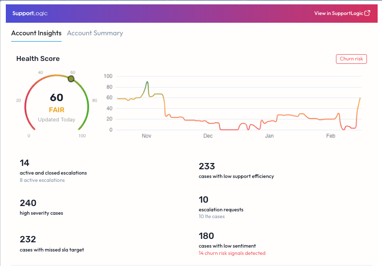 Account Insights iFrame: Account Teams and Customer Success Teams can now see the contribution factors that are impacting the Account Health Score. For example, a spike in number of active escalations, high severity cases, and cases with low sentiment could be causing the account health score to drop. With this insight, users can connect with the right stakeholders to help resolve the situation or choose to review further in SupportLogic.