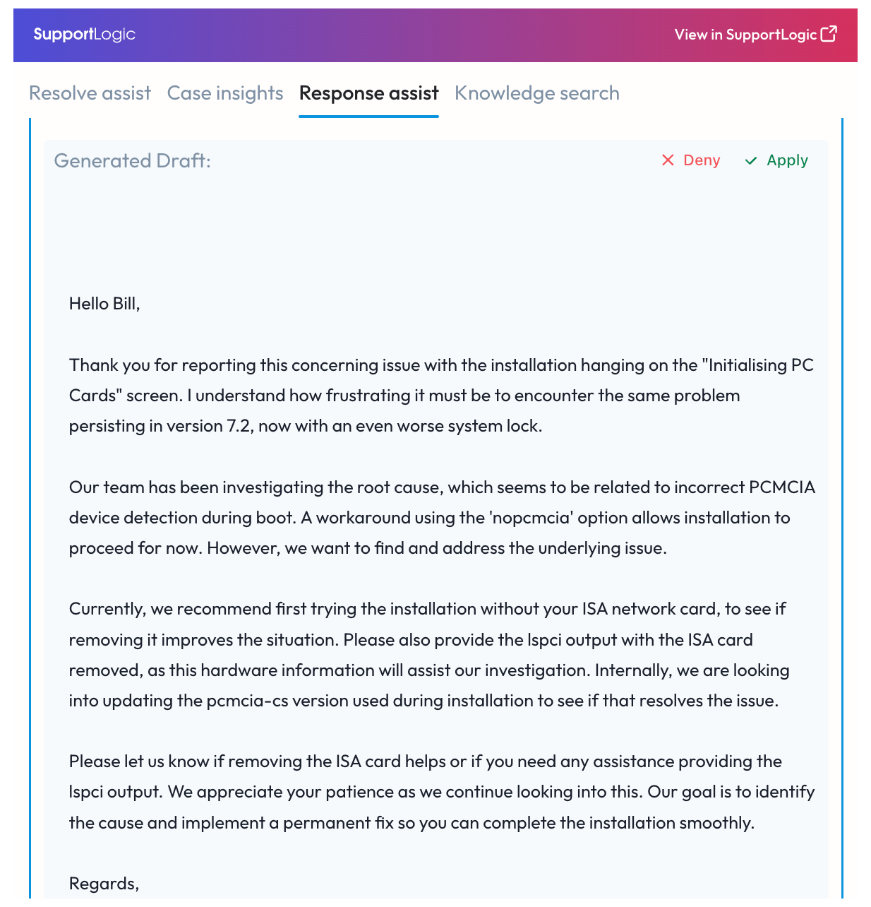 Enhanced draft response and tone generation: Resolve and Response Assist now offers an enhanced “generate draft response” experience. Support Engineers are presented with a draft response that is based on the latest status and next steps as determined by the case and knowledge summary. It also takes into consideration the last response sent to customer to ensure the draft response is incremental and not repetitive. Support Engineers are given the control to accept or deny the generated draft response and tone changes, allowing them the opportunity to thoroughly review the GenAI generated content.