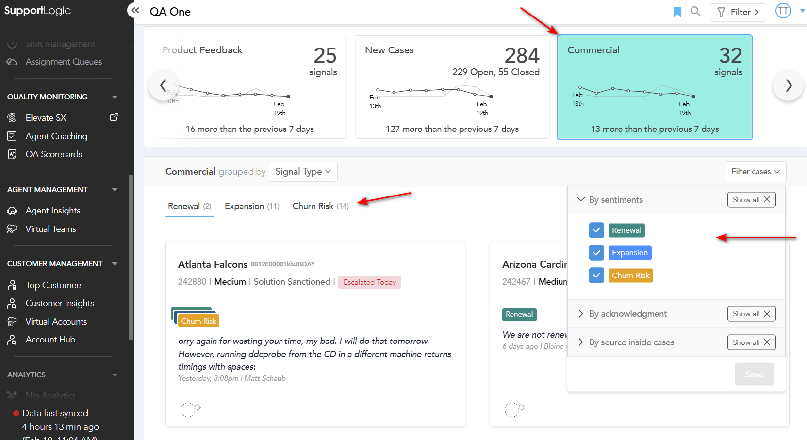 The Expansion and Renewal signals, recently introduced as part of our Commercial signals group, have been added under the new Commercial card on the main application pages, such as the Console page, Agent insights, Account insights, and Text analytics.