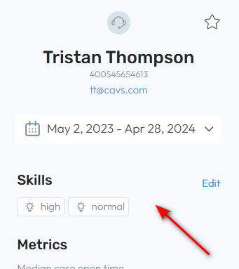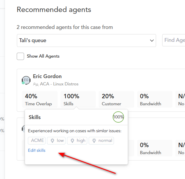 - We added the ability to manually add and remove an agent’s skills, using the list of skills previously added to the customer’s ontology list. This can be seen on the Recommended Agents cards when manually assigning an agent and on the Agent Insights page.