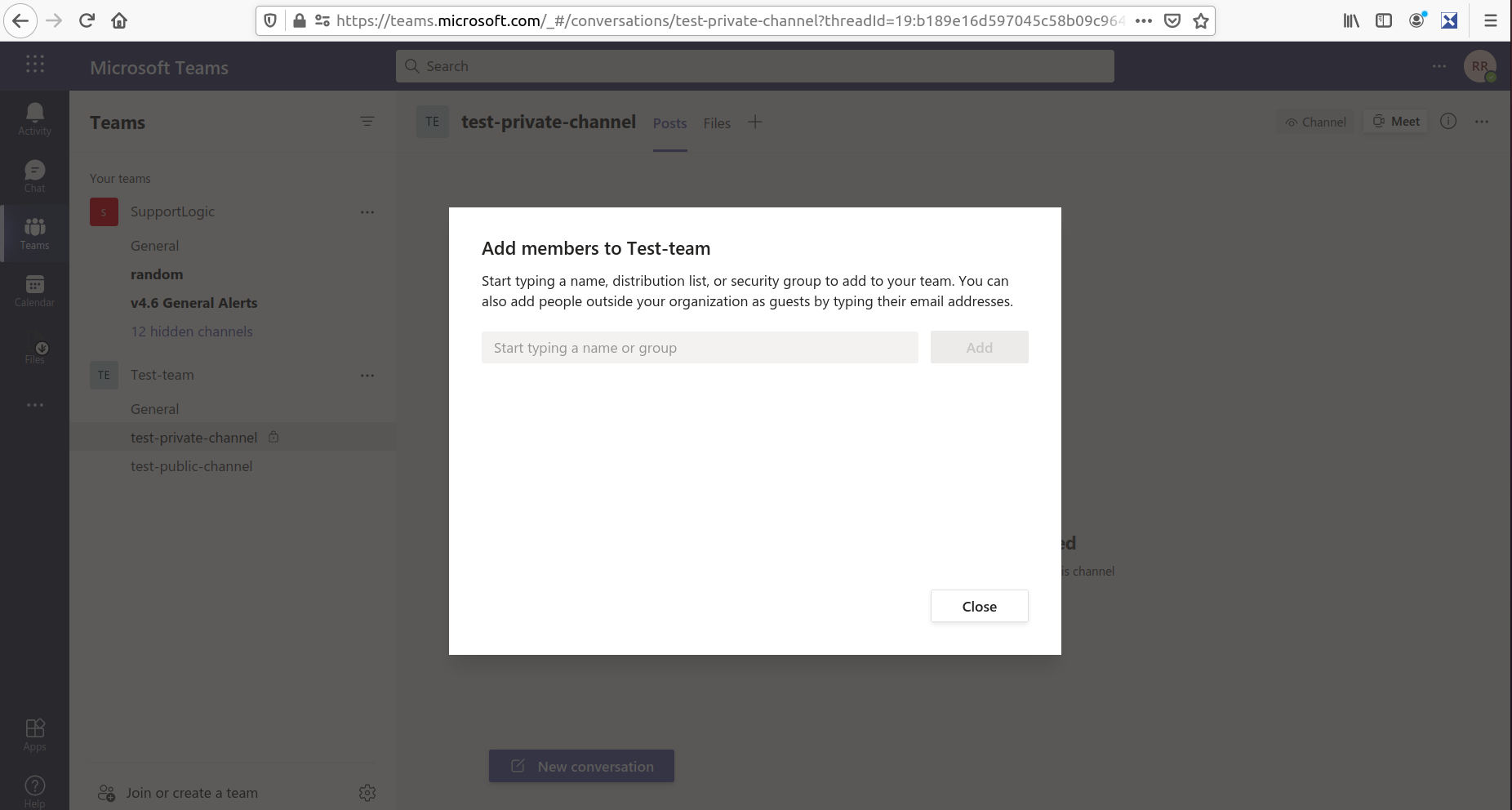 - In the MS Teams UI, add the "SupportLogic" MS Teams user as a member to the specific channel.