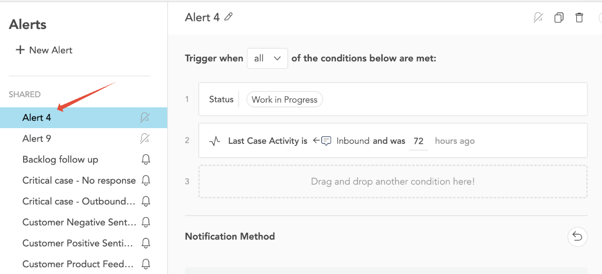 • Scroll to the bottom of the alert configuration page to locate the Notification Method section.