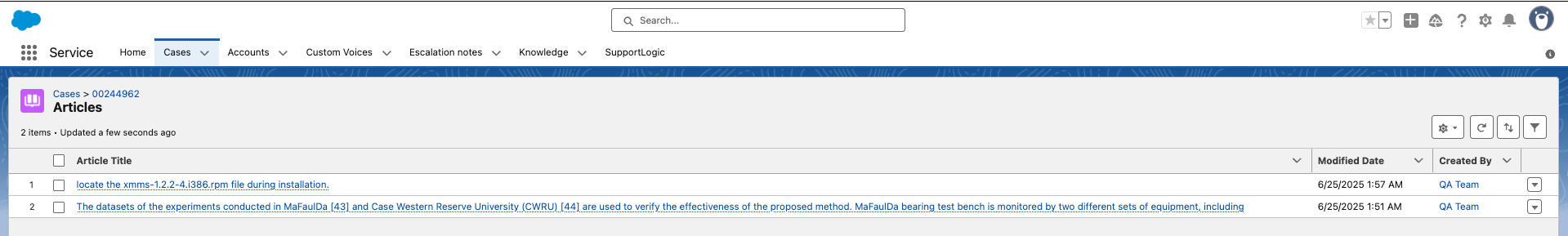 Write back Case-Knowledge Article association to Salesforce - Support Engineers can link one or more knowledge sources to a Case if they found it useful in resolving the reported issue. If the linked knowledge source is a Salesforce Knowledge Article, we offer the ability to create a Case-Article association in Salesforce. This allows Support Engineers to see the Salesforce Knowledge Article as a related record in Salesforce Case detail page.