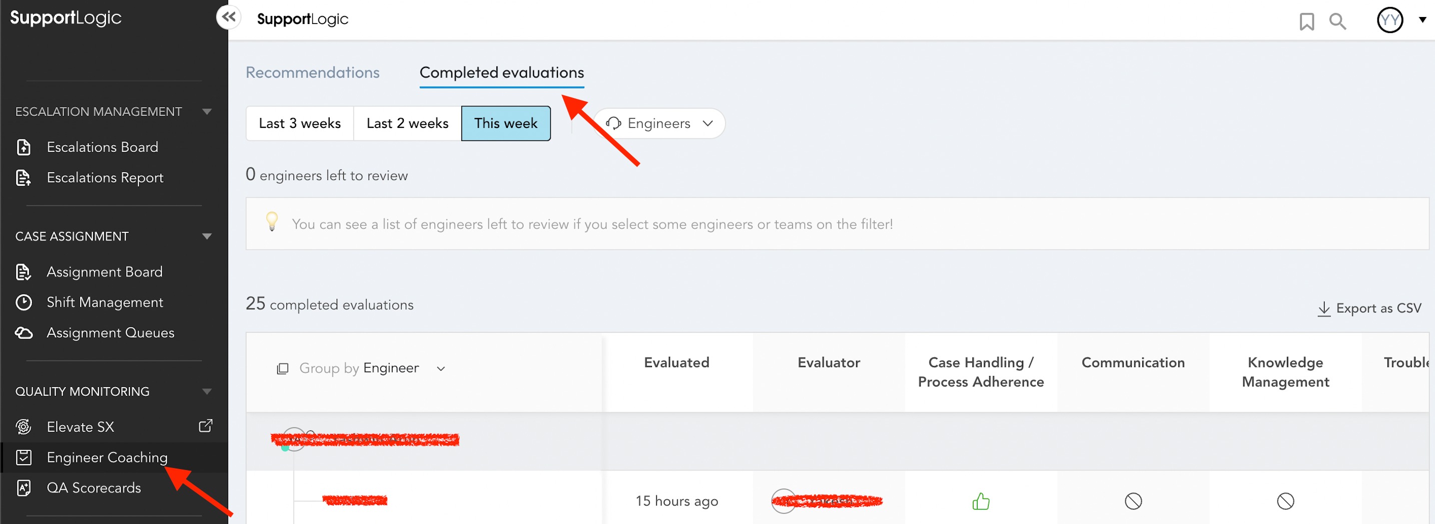 While a consolidated view is not available, managers can view the evaluations they have personally conducted for specific agents within a specific timeframe by navigating to Support Engineer Coaching -> Completed Evaluations.
