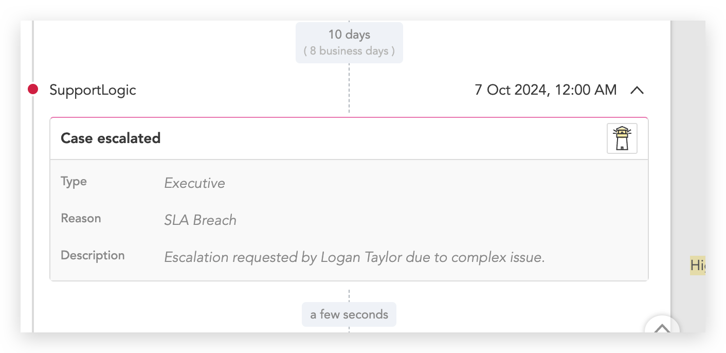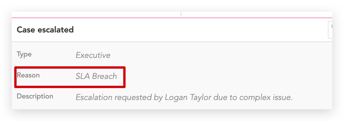 Introduction: This article is about the issue where the escalation reason code appeared in the SupportLogic UI instead of a descriptive label. It explains why this occurred, how it could be resolved, and the next steps. Description: In SupportLogic, the escalation reason clearly describes what caused it. For example, if the escalation is due to an SLA breach, this will appear in SupportHub along with a description of the trigger.