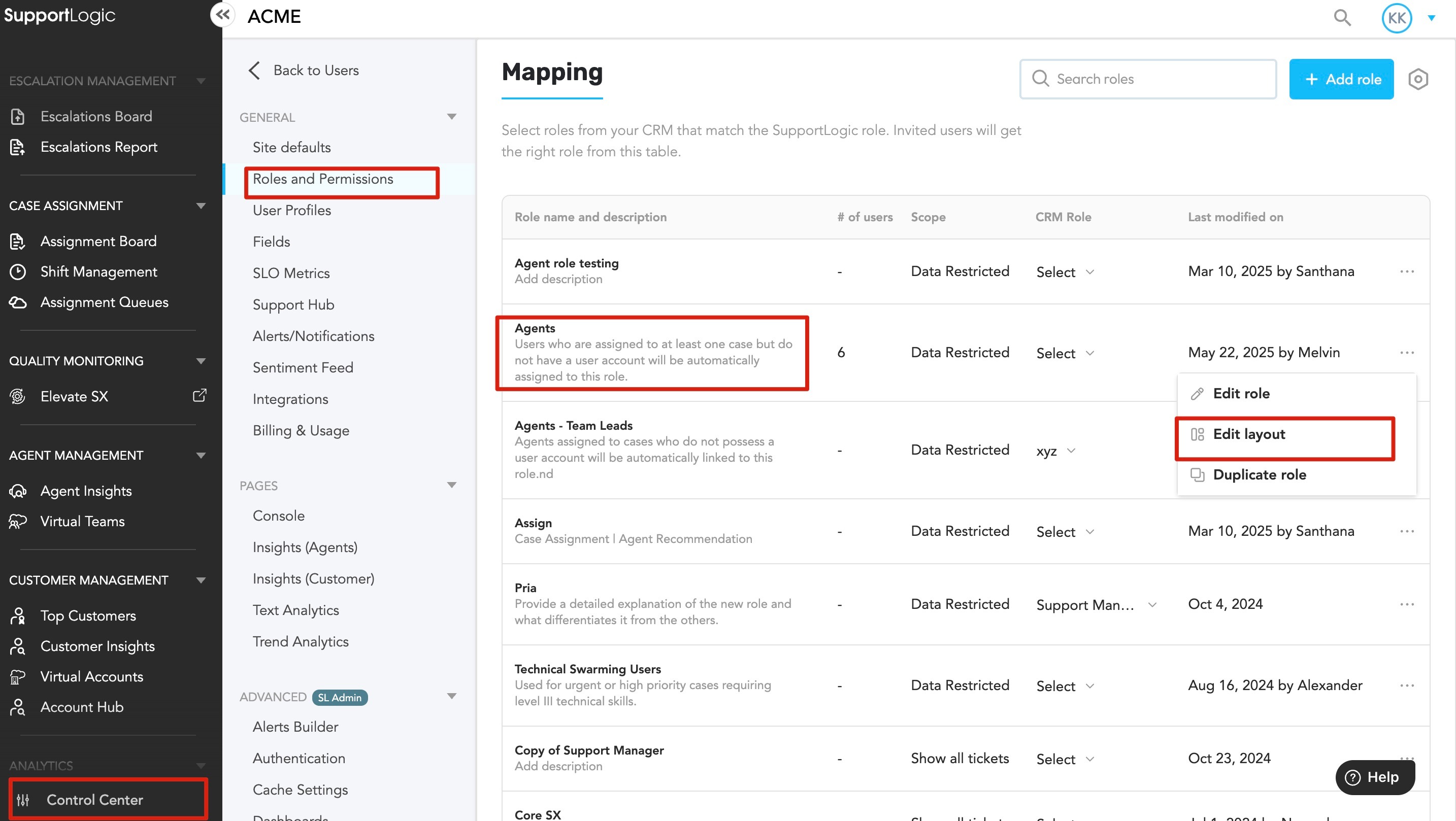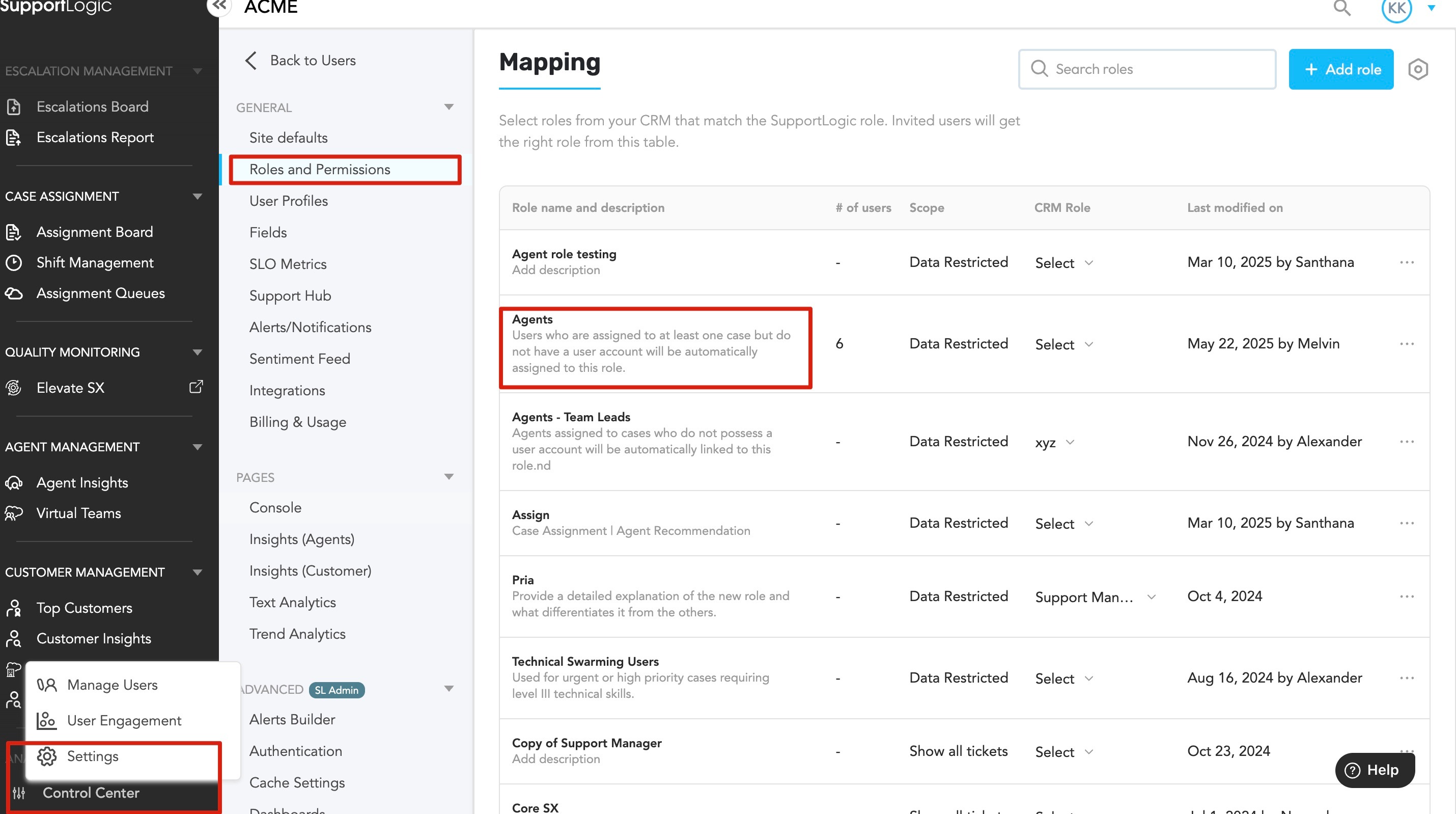 PurposeThis article explains how Admin's can configure which application pages and modules are accessible to users assigned the Agent role in SupportLogic. By customizing module visibility, the Admin's can ensure that only agents access the pages relevant to their responsibilities, enhancing usability and security. Issue DescriptionWithout proper configuration, agents may have access to application modules that are not relevant to their role. Configuring module access ensures a streamlined user experience and prevents unauthorized access to unrelated features. Resolution / Configuration Steps1. Access Control Center – Settings