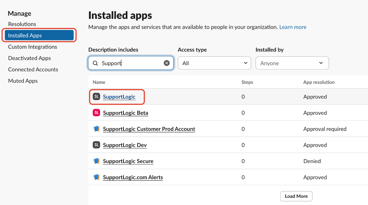 Under Installed Apps, find and click on SupportLogic.
