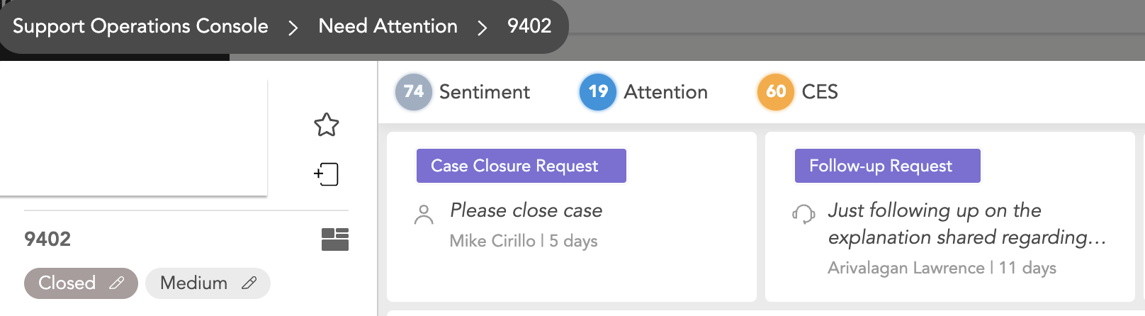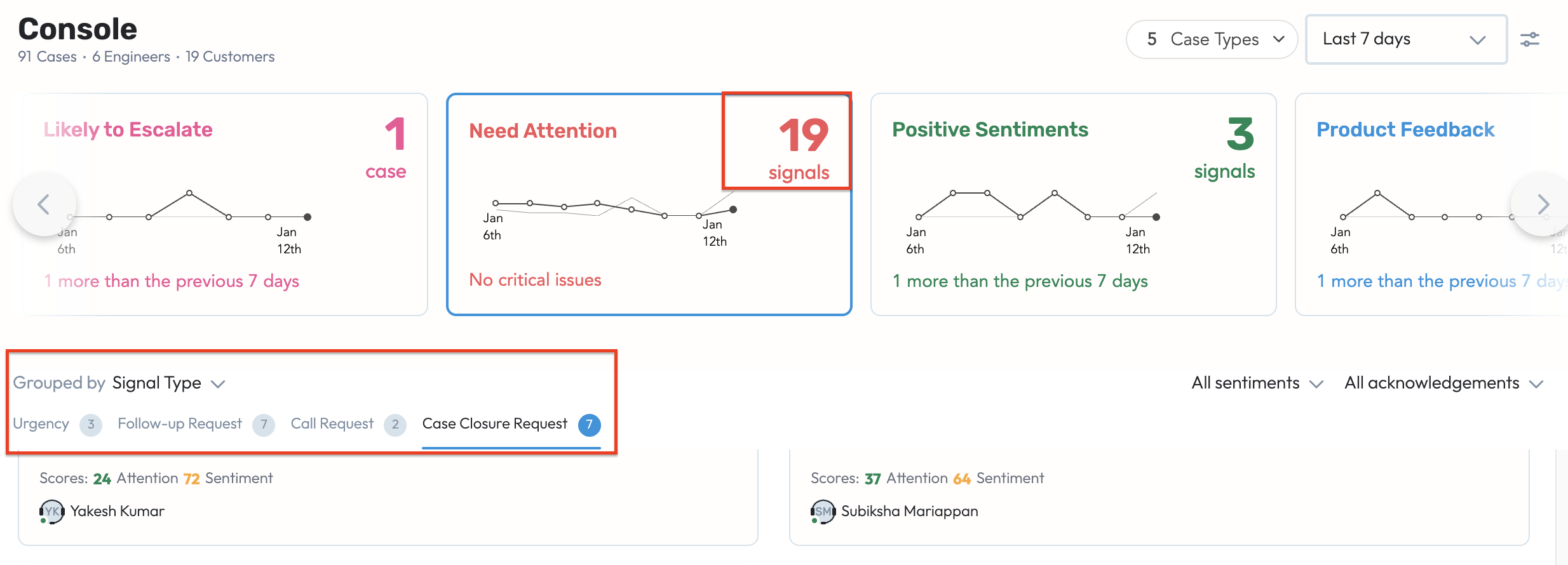 SupportLogic analyzes customer communication and identifies specific phrases that indicate different types of sentiments or signals. These signals are then grouped under sentiment categories like Need Attention, Positive, Negative, etc.