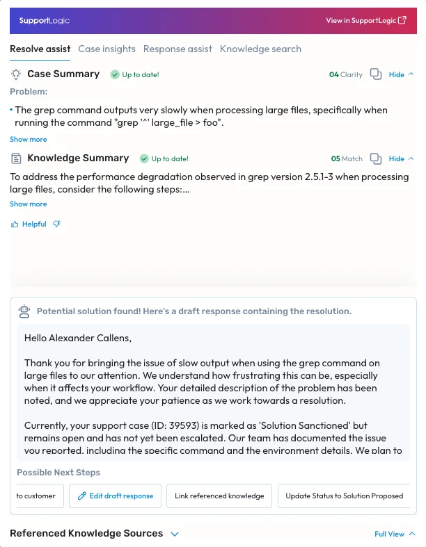 Searches across cases, tickets, and knowledge sources