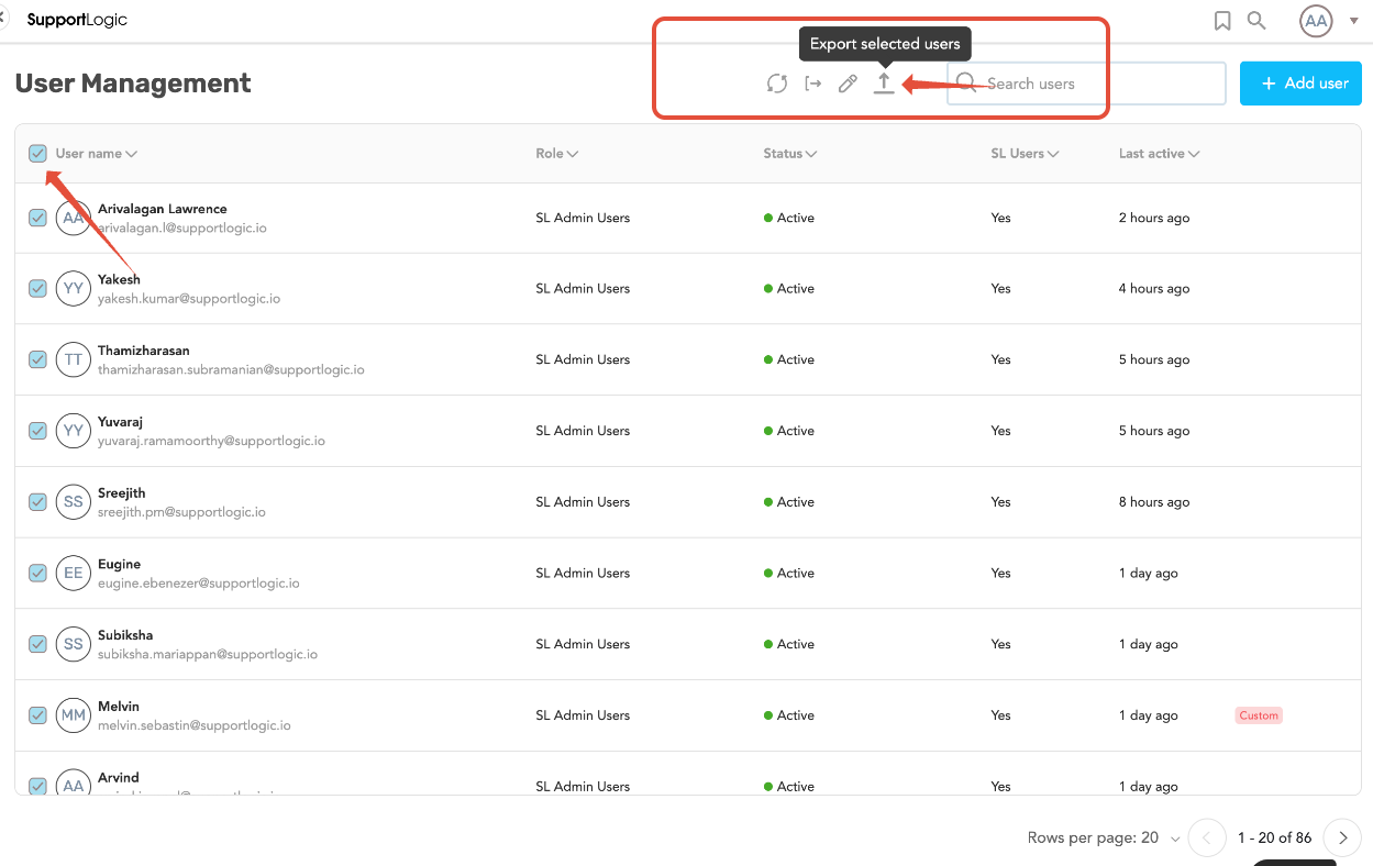 SupportLogic provides an easy way to export a report containing all users configured in the platform. This report can be used for auditing, user management, and administrative purposes.