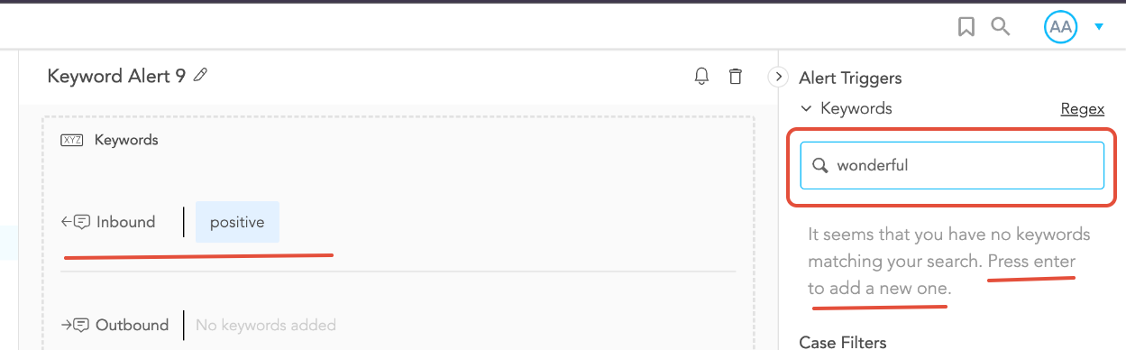 For example, entering “positive” and pressing Enter will add it as a new keyword for the alert.